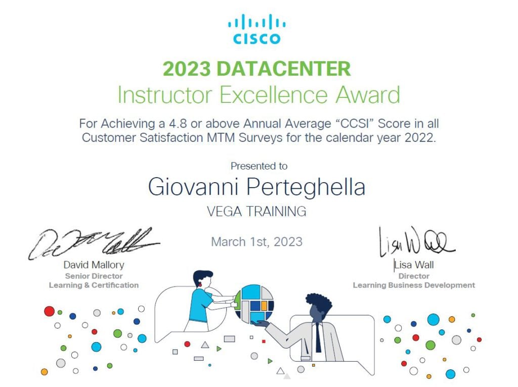 Sono davvero orgoglioso che il nostro Trainer Giovanni Perteghella abbia ricevuto da Cisco il riconoscimento come Instructor Excellence per il lavoro svolto nel 2022… Ricerca e Sviluppo costante, Duro Lavoro, Passione…. Grazie Giovanni e grazie a tutto il team di Vega Training !!! Trainer Coordinator – Paolo Bruno Zuppetta